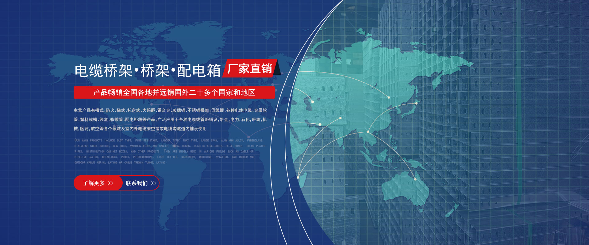 主營(yíng)產(chǎn)品有槽式、防火、梯式、托盤式、大跨距、鋁合金、玻璃鋼、不銹鋼橋架、母線槽、各種電線電纜、金屬軟管、塑料線槽、線盒、彩鍍管、配電柜箱等產(chǎn)品,款式多樣,結(jié)構(gòu)新穎,連接牢靠,強(qiáng)度密封性好,產(chǎn)品暢銷全國(guó)各地,遠(yuǎn)銷國(guó)外二十多個(gè)國(guó)家和地工,深受國(guó)內(nèi)外用戶的好評(píng),竭誠(chéng)歡迎海內(nèi)外朋友蒞臨合作
